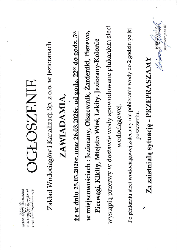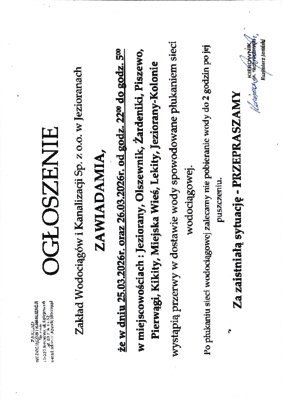 Zakład Wodociągów i Kanalizacji Sp. z o.o. w Jezioranach zawiadamia że w dniu 25.03.2026 oraz 26.03.2026 wystąpią przerwy w dostawie wody dla miejscowości Jeziorany, Olszewnik, Żardeniki, piszewo, Pierwągi, Kikity, Miejska Wieś, Lekity, Jeziorany-Kolonie.